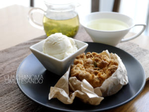 茶茶の間ではりんごの香りに合わせるなら咲耶、と言いても良いくらいおすすめのあわせになります。クレープと一緒に楽しむことで広がる心地よい香味をご体験ください。