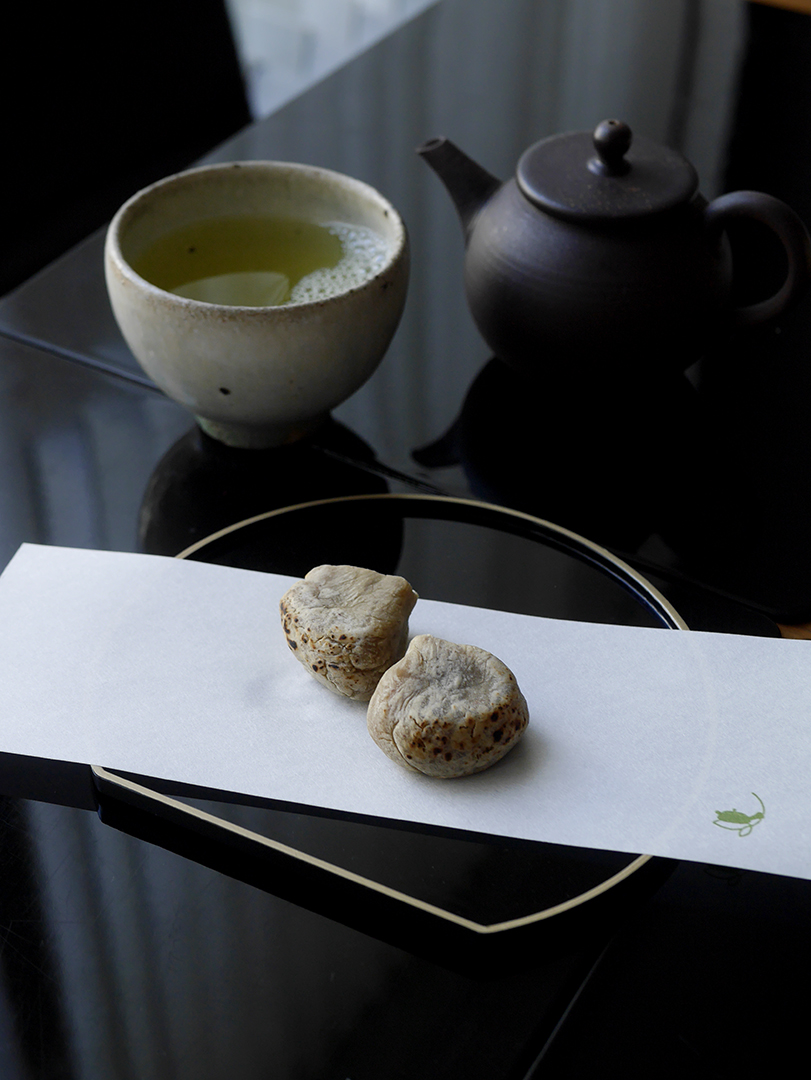 そして最後は定番の栗きんとん。炙ることで香ばい香りを加えます。合わせのお茶は当店では栗の味わに合わせるなら断然コレ!の天薫です。