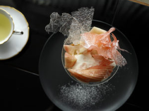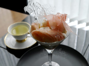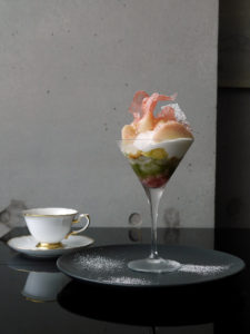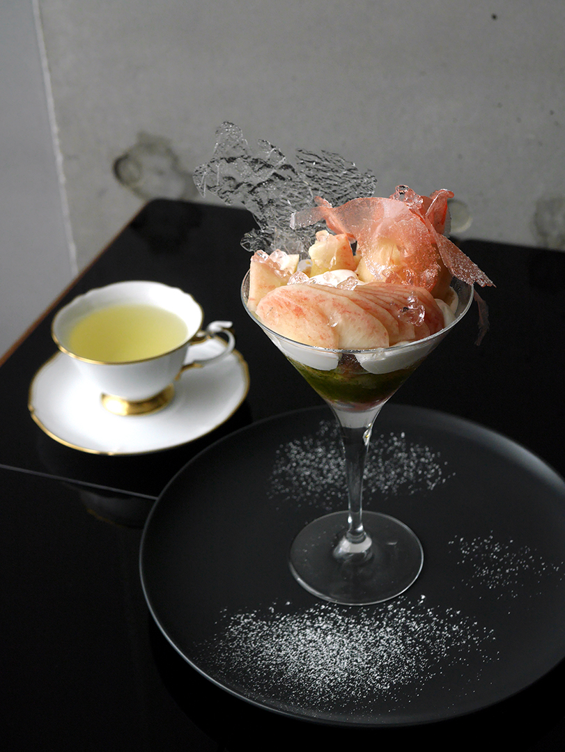 『白麗』は香りが良く、澄んだ味わいが特徴、パフェのグラスの中のパーツも追加するなど若干の調整、あわせのお茶も変更してご提供する予定です。